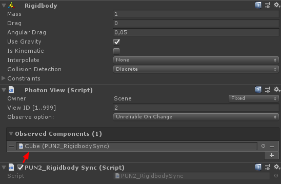 }- Anexar PUN2_RigidbodySync a ambos os cubos e também atribuí-lo a Photon View "Observed Components":