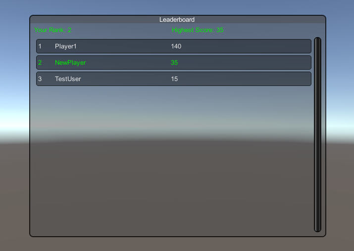 LeaderboardUser[] leaderboardUsers;NOTA: A variável currentScore é o que você usará no jogo para rastrear as pontuações dos jogadores. Este valor será enviado para o servidor e armazenado no banco de dados, é recomendado ofuscar esse valor em ordem para proteção contra hackers.